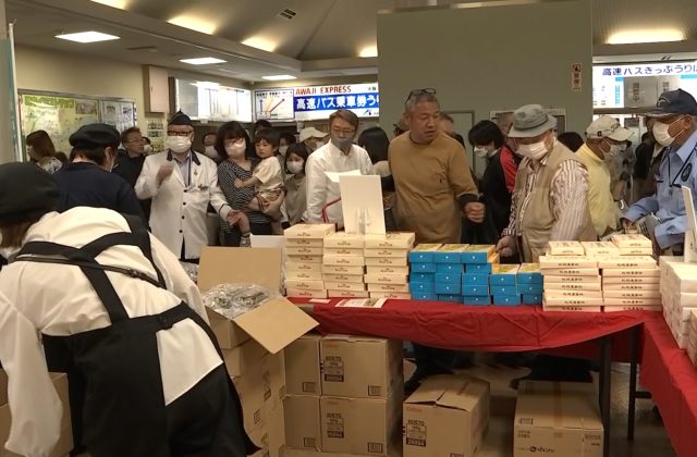 洲本バスセンター内に設けられた販売スペースでは、マイスター工房八千代の「天船巻きずし」のほか、アップルパイや高級食パンなどが並び、午前10時のオープンを前に200人以上が列をつくりました。
