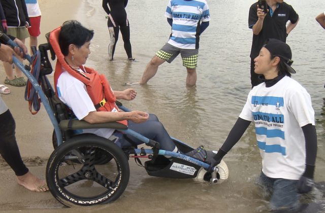 20日は17人が参加し、車いすの人も砂浜の上を進むことができる「ビーチマット」を60メートルほどつなげた後、水陸両用の車いす「ヒッポキャンプ」に乗り移動したり、海に入ったりする体験に挑戦しました。
