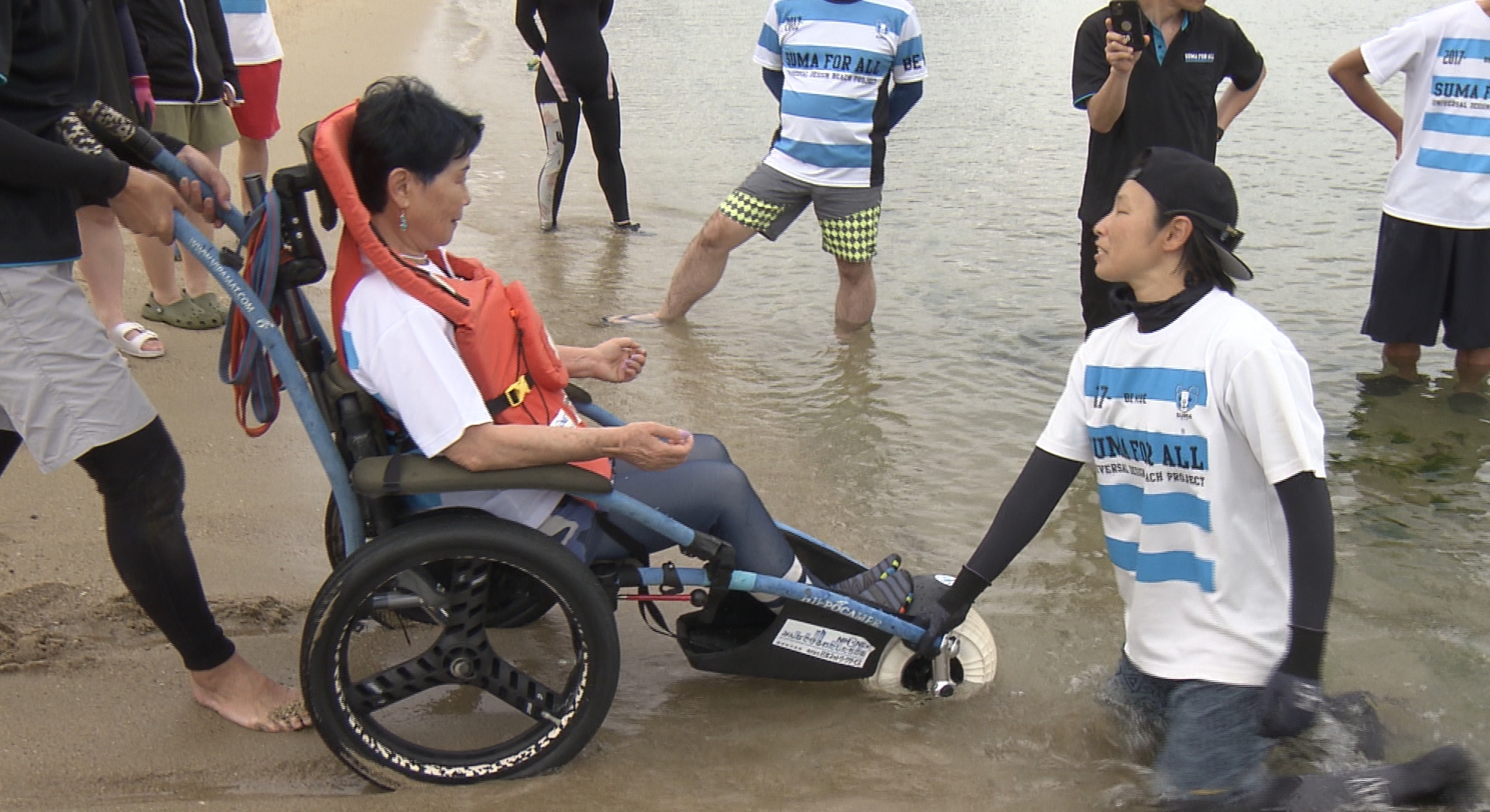 車いすの人や身体に障害がある人も、海水浴が楽しめることを知ってもらおうと、兵庫県神戸市の須磨海岸で20日、水陸両用の車いすの使い方を学ぶ講習会が開かれました。