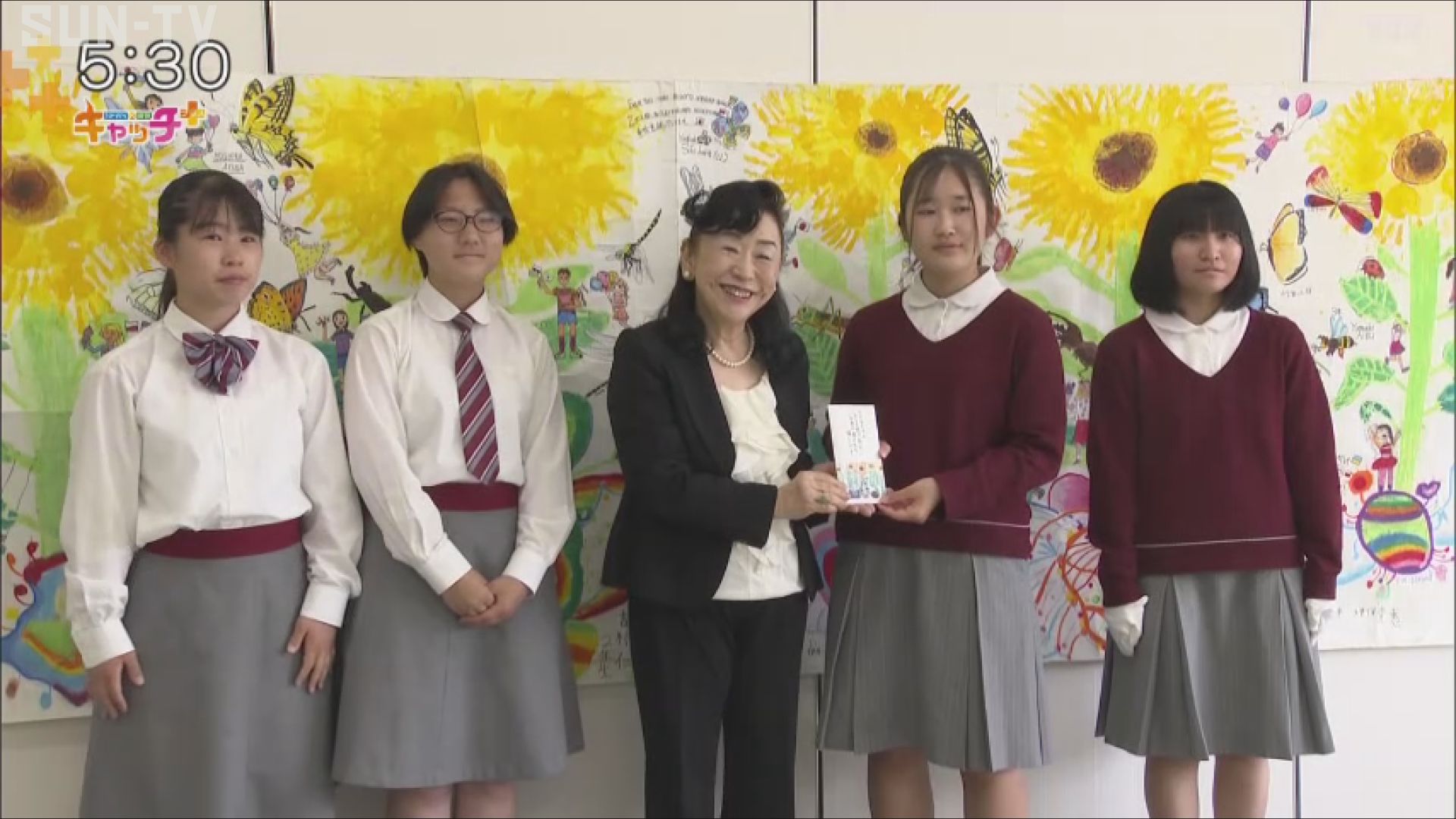 姫路女学院高校は、姉妹校であるポーランドのナザレ高校に生徒4人が26日から研修に行くということで、中嶋さんはヒマワリの絵画と集まった義援金20万円を託しました。