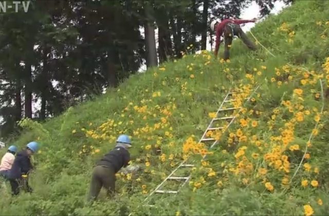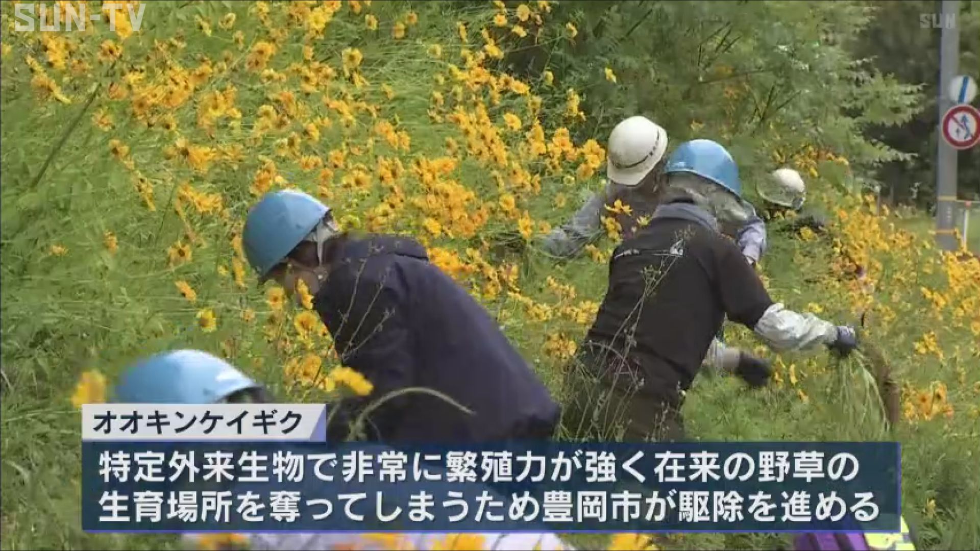 駆除作業が行われたのは、豊岡市日高町にある植村直己(うえむらなおみ)冒険館近くの道路の法面で、高さおよそ5メートル、幅40メートル近くに渡ってオオキンケイギクが咲いていました。
