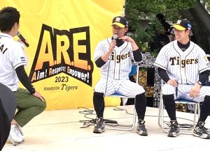 26日、1球勝負に先立って、阪神タイガースWomenの上本博紀監督(阪神在籍2009~2020年)と、岩本輝投手コーチ(阪神在籍2011~2016年)が、球場外周で行われたトークショウに登場した。