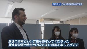 「こんにちは。シリア大使館代理大使のナジブ・エルジです。シリアは過去12年間、テロや他国の経済制裁によって国民生活が不安定な状態でした。さらに2月6日の大地震で何千人もの犠牲者、建物、インフラ等が破壊しました。日本は直ちに支援物資を送ってくださったり、日本国民のみなさまが大使館に寄付をくださりました。奈良県西大和学園の中学生のみなさまが地震で被災したシリアの子どもたちを支援しようと物資を集めてくださったこと、日本の若い人たちのモラルの高さに感動しました。5月初旬私は西大和学園を訪れ、校長先生や生徒の皆さんとお会いし、集めてくださった物資をどのようにシリアまで輸送するのかを協議いたしました。最後に素晴らしい支援活動をしてくださった西大和学園の生徒の皆さまに感謝を申し上げます。ありがとうございます」