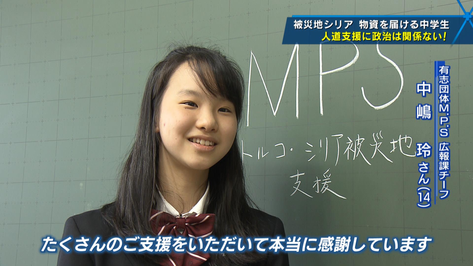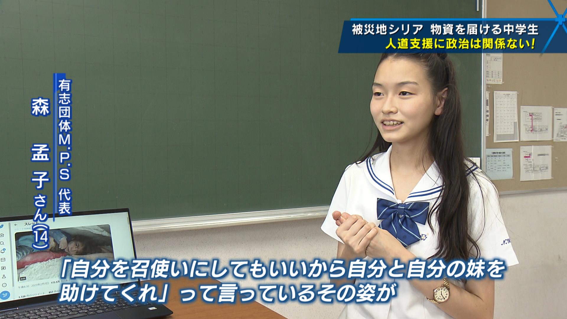 中学3年生の森孟子さん(14)は有志団体M.P.S(Make people Smile)を立ち上げ、活動を続けています。支援を始めるきっかけは、SNSで地震によって生き埋めになり助けを求める姉妹の動画を見かけたことでした。