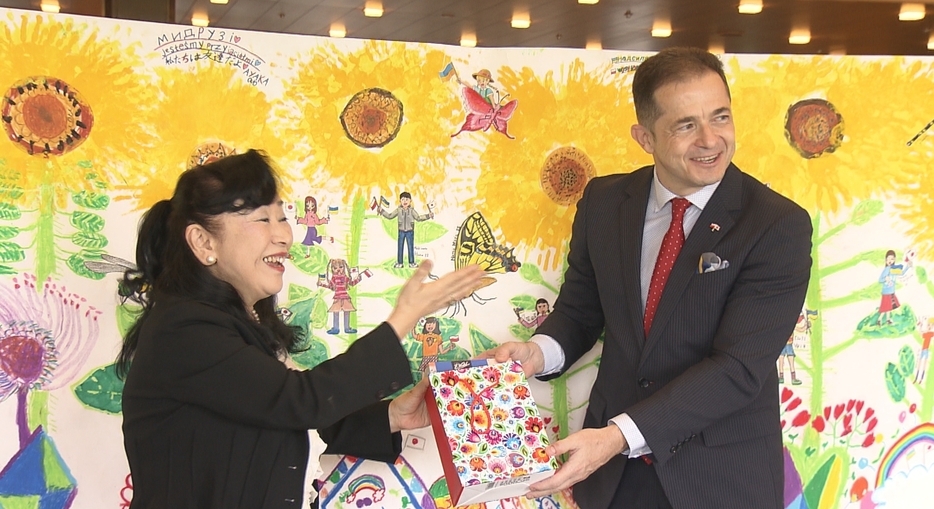 12日には、神戸を訪れているポーランドのパヴェウ・ミレフスキ駐日大使がアトリエ主宰の中嶋洋子さんと対面し、「一つ一つの支援と共感の意というのは、金よりも価値が高い」「ヒマワリプロジェクトは、苦しい状況にある避難民に寄り添っている」と感謝の気持ちを述べました。
