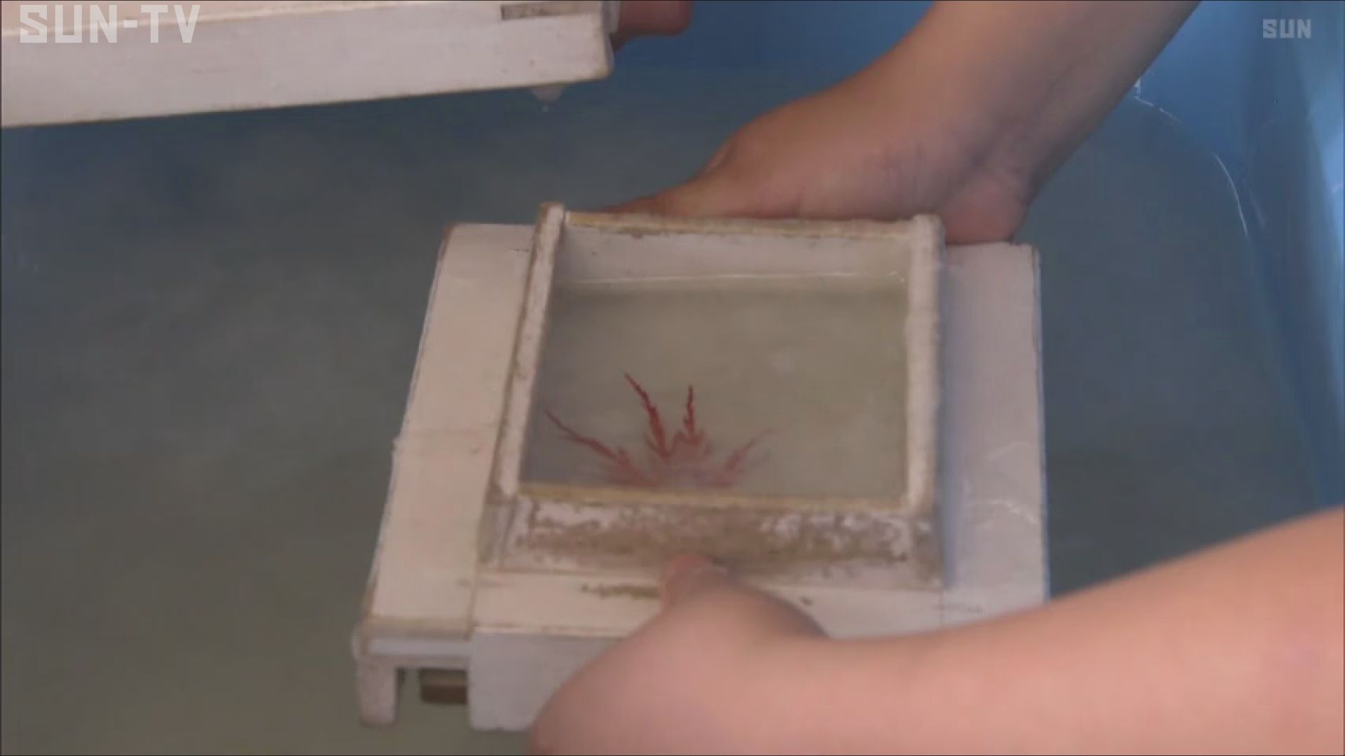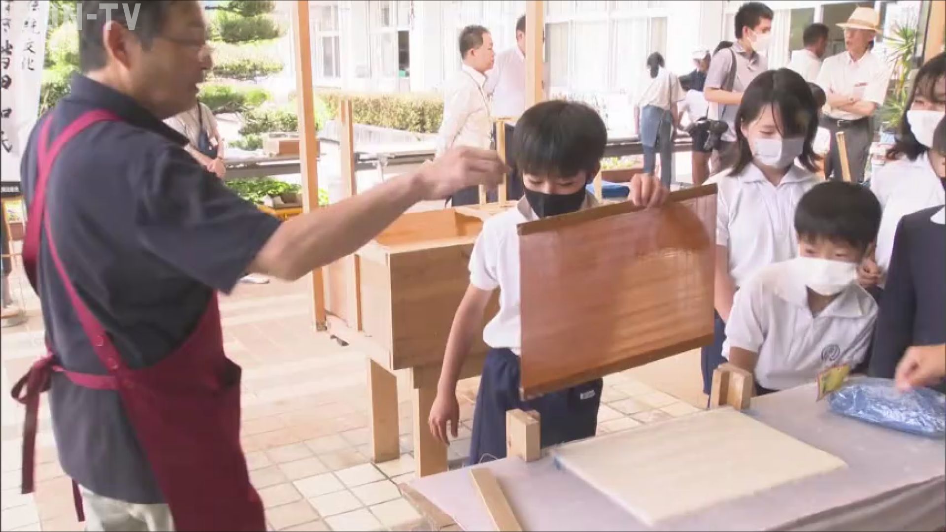 児童たちは、皆田和紙保存会の人たちの指導を受けながら、紙の厚さが均一になるよう、丁寧に薄くのばしていきました。