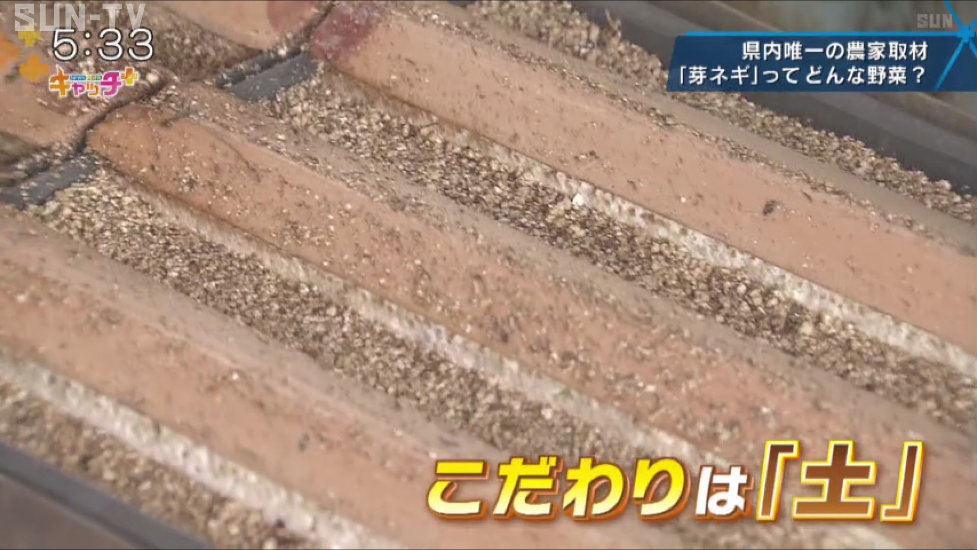 一般的に芽ネギは、スポンジに種を植え、水につけた状態で育てる「水耕栽培」ですが、阿部さんは箱の中に土を薄くまいて育てます。土に植えることで収穫後の芽ネギの日持ちが良くなるそうです。