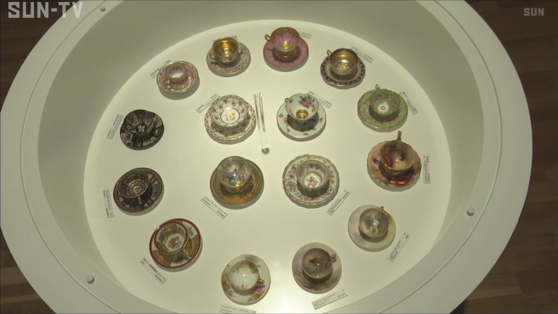 中には、京都で作られた京薩摩・錦光山のカップや、光に透かすと日本髪の女性が浮かび上がる石川県・九谷焼の作品など国内の名品も展示されています。