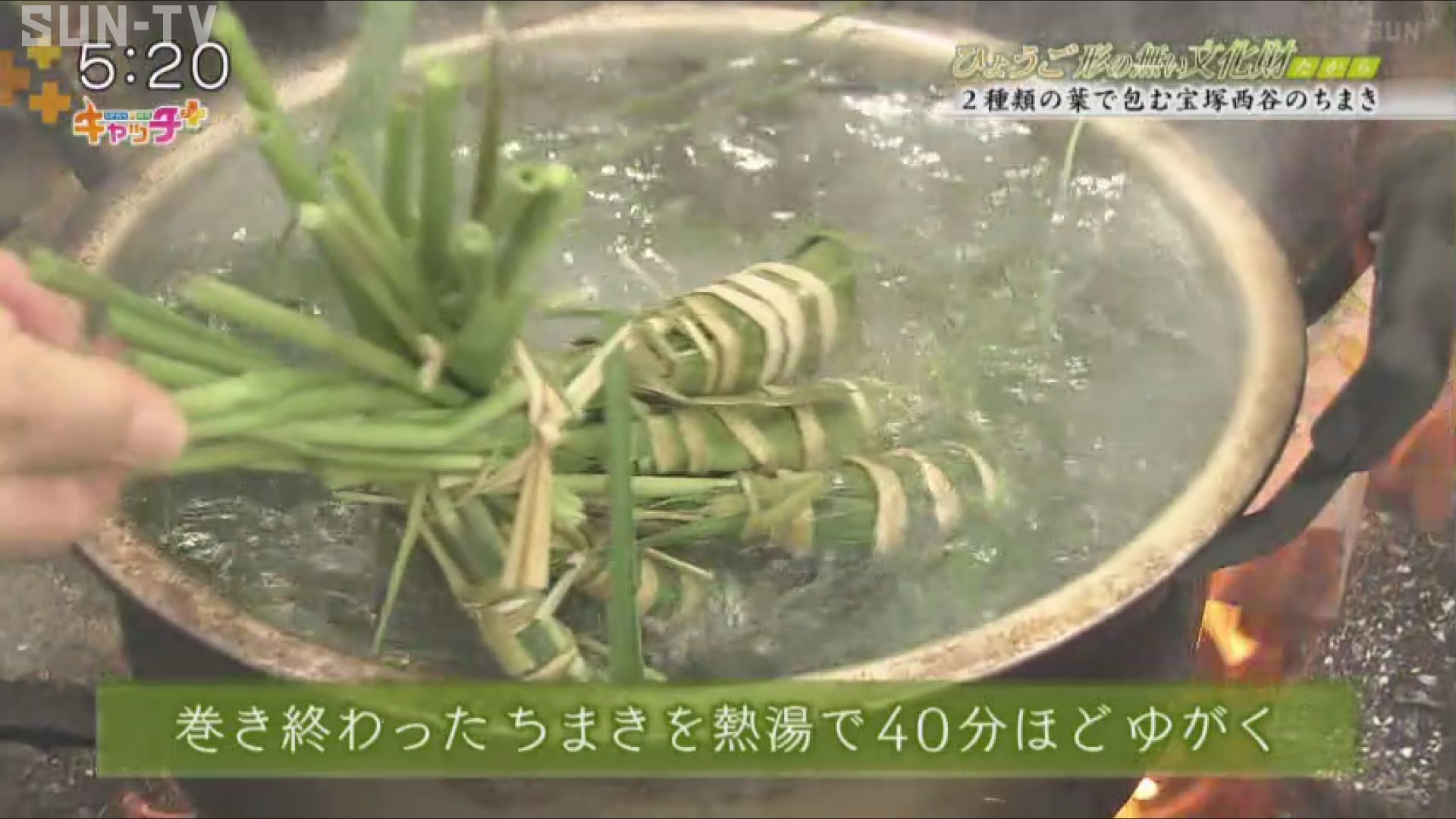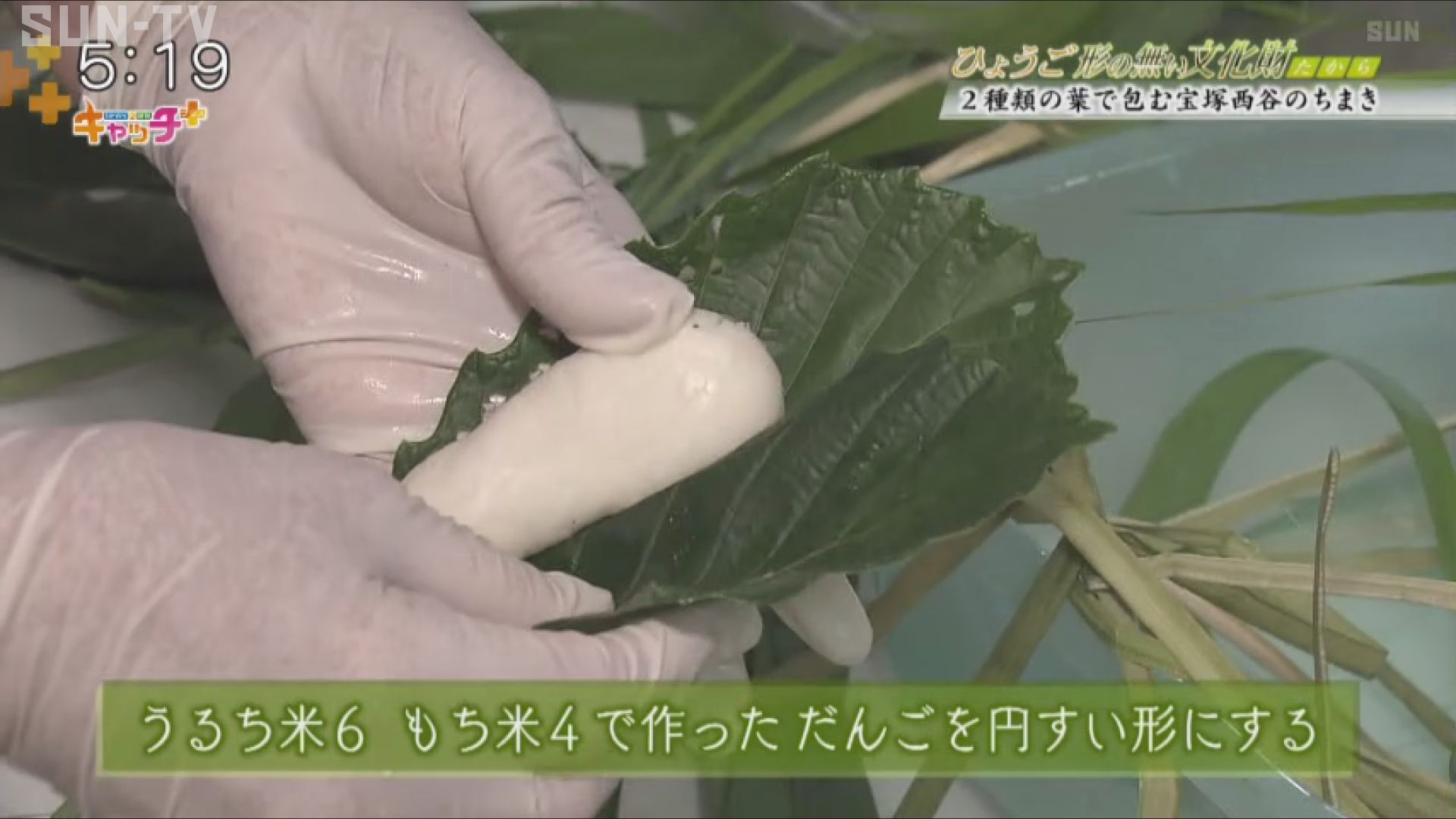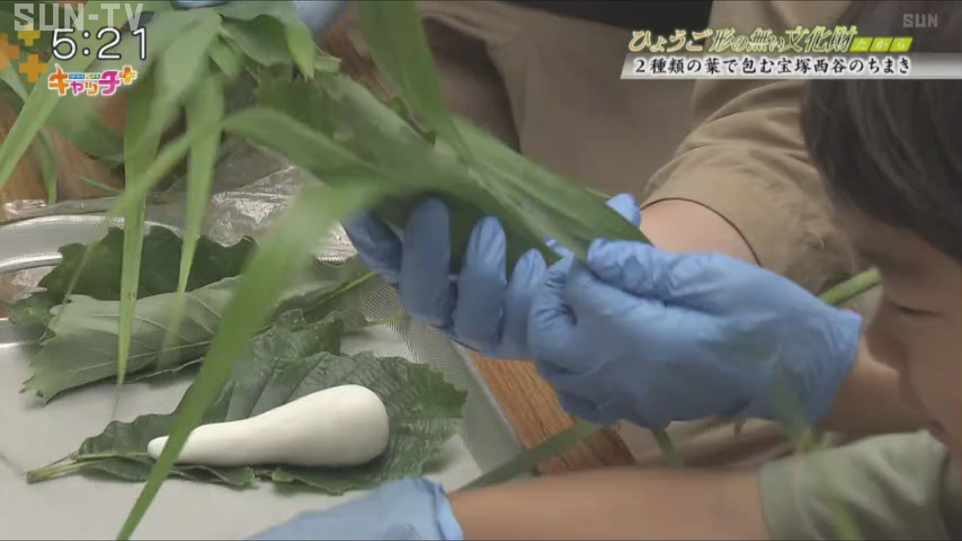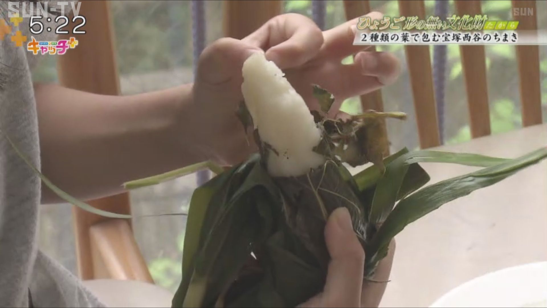 宝塚市西谷地区に伝わる「ちまき」。ナラガシワとヨシの2種類の葉でだんごを包むのが特徴です。