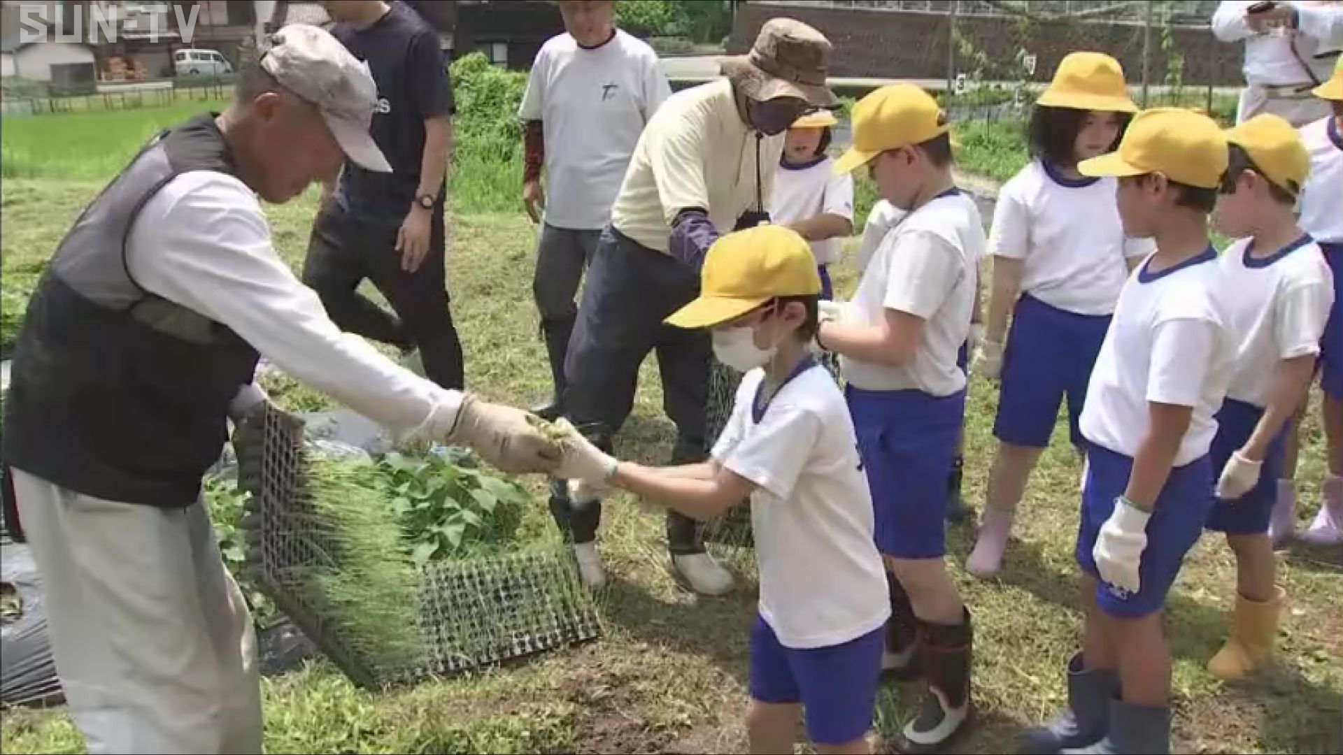 児童らは小学校近くの体験学習用の畑で地元の生産農家から指導を受け、20センチほどの長さの苗およそ1000本を植え付けていきました。