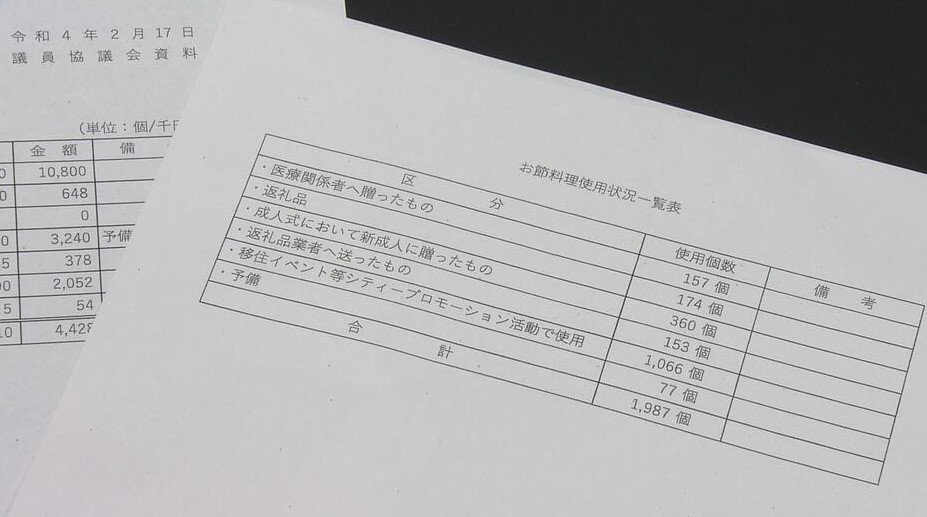 情報公開請求で内訳が開示され、800を予定していた医療従事者には157セット。1000を予定していた返礼品は174セットにとどまっています。過半数の1066セットは、移住イベントなどの参加者に無料で振る舞われていたとされています。さらに、およそ500セットが新成人や市内の返礼品事業者などに無料で配られていました。