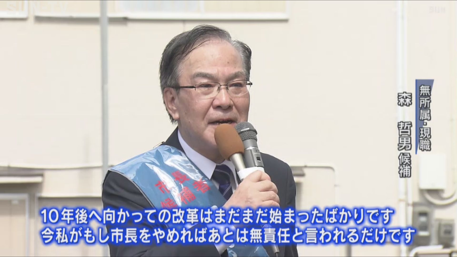 3選を目指す現職の森さんは、集まった支援者を前に、これまでの実績をアピールするとともに、病院の再編統合を進めたいと訴えました。