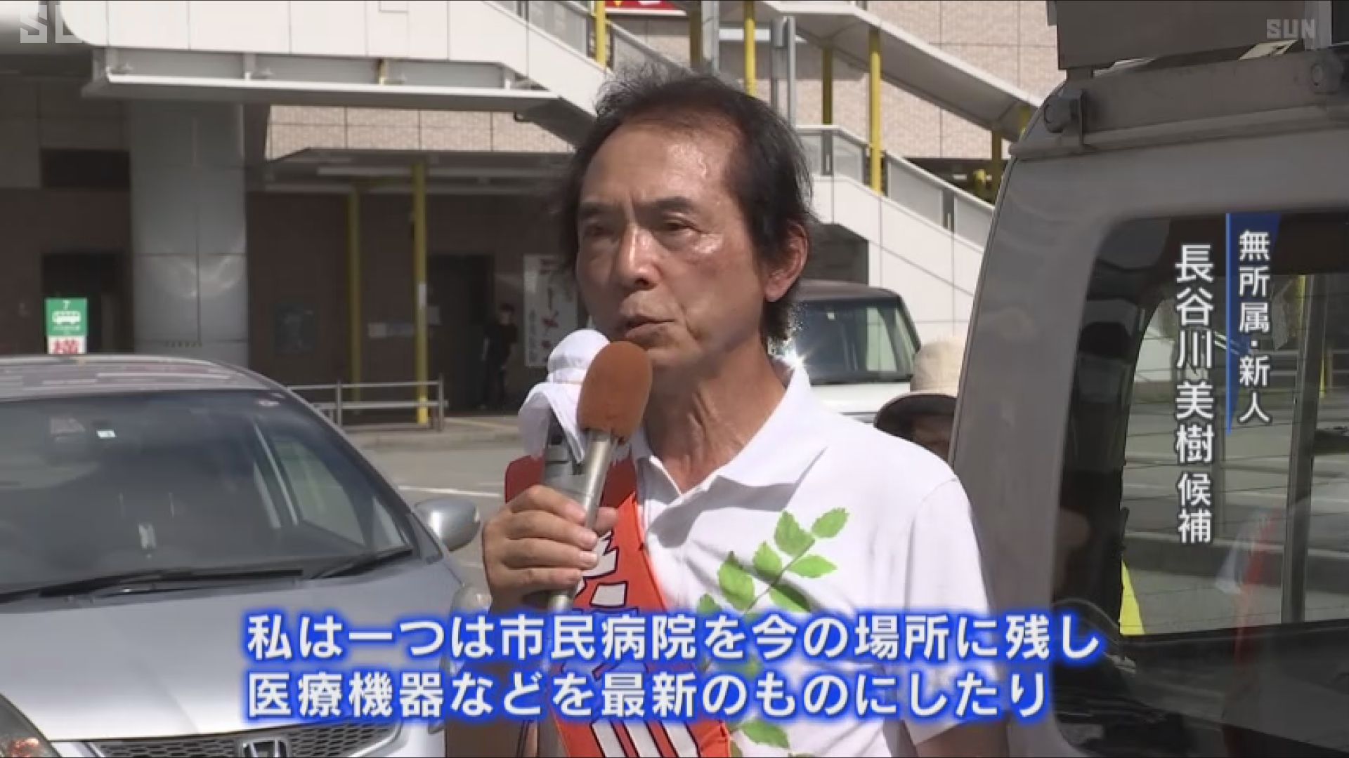 前回の市長選に立候補し敗れた元共産党市議で新人の長谷川さんは、病院の再編統合について強く批判し、市民病院の継続を訴えました。