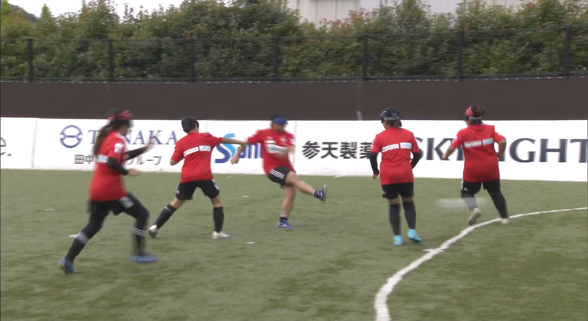 ゴールキーパー以外が視覚障害者で、仲間の声や音を頼りにプレーする5人制のサッカーです。