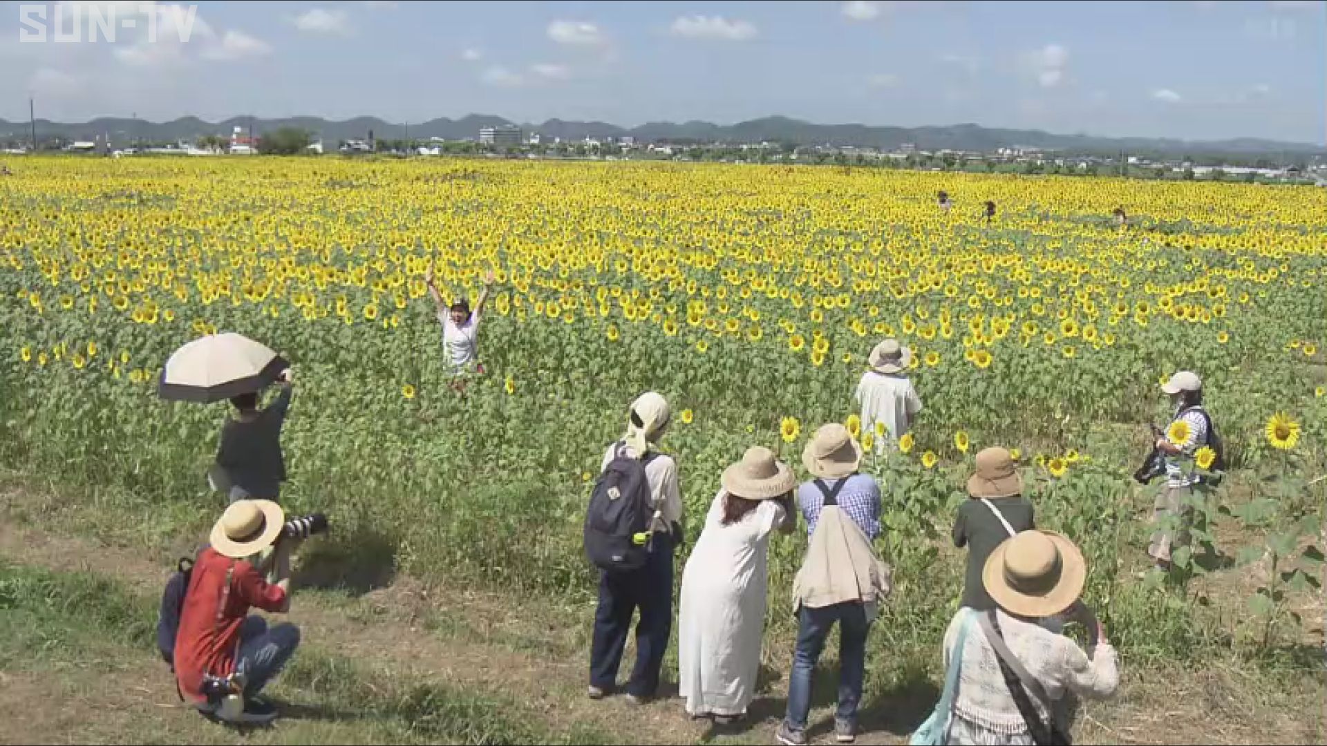 厳しい日差しが照り付ける中、空に向かって伸びるヒマワリ。 それぞれが黄色い大きな花を咲かせています。 小野市にある「ひまわりの丘公園」の南側の畑約2.8ヘクタールでは、40万本ものヒマワリが満開となっていて、訪れた人が、畑一面を埋め尽くすヒマワリの中で写真を撮るなどしていました。