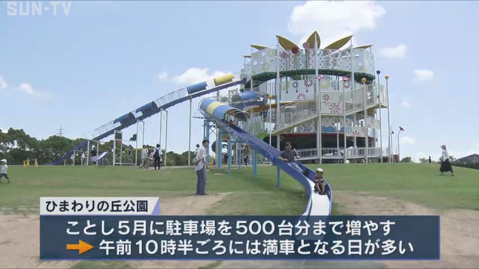 また、ヒマワリ畑の隣には公園もあり、訪れた家族連れらが噴水で遊ぶなどしていました。 市によりますと、公園は、入園料と駐車場がともに無料のため、週末や連休には、市外から訪れる人が多く、2023年5月に駐車場を500台分まで増やしましたが、午前10時半ごろには満車となる日が多いということです。