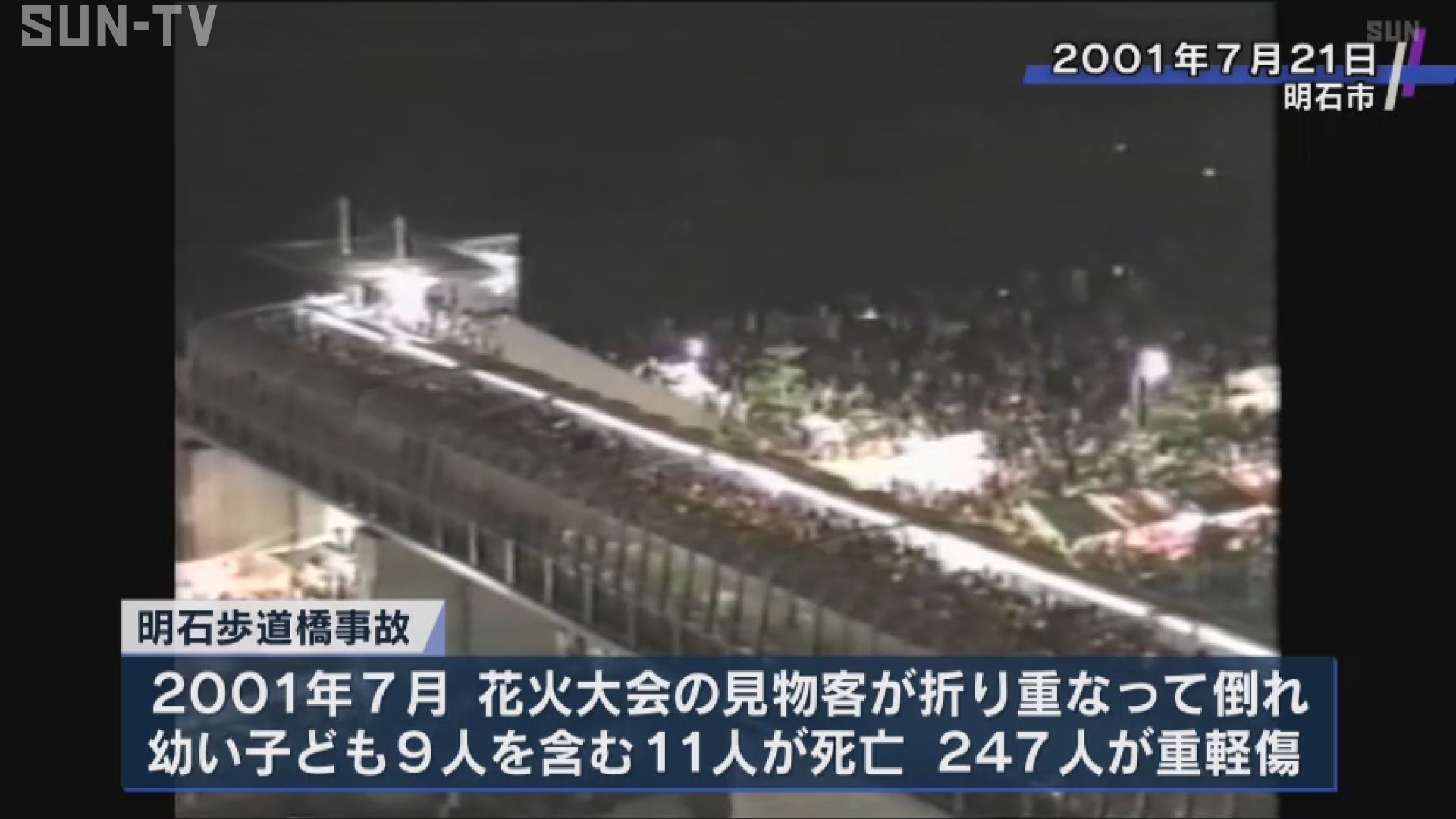 2001年7月、明石市の歩道橋で花火大会の見物客が折り重なって倒れ、11人が死亡、247人が重軽傷を負いました。