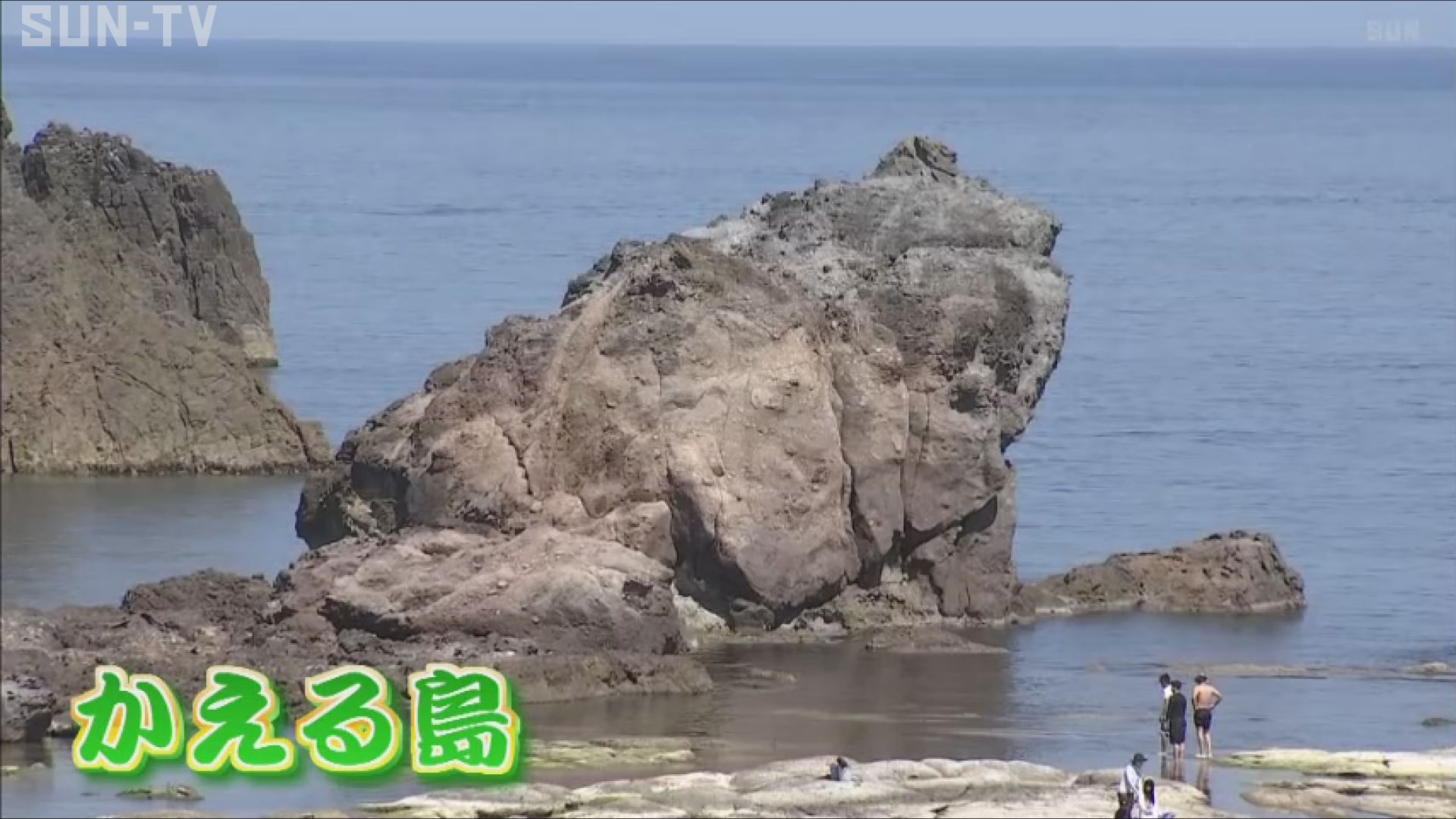 香美町香住の今子浦海水浴場沖合にある巨大な岩は、形がカエルに見えることから「かえる島」と呼ばれています。