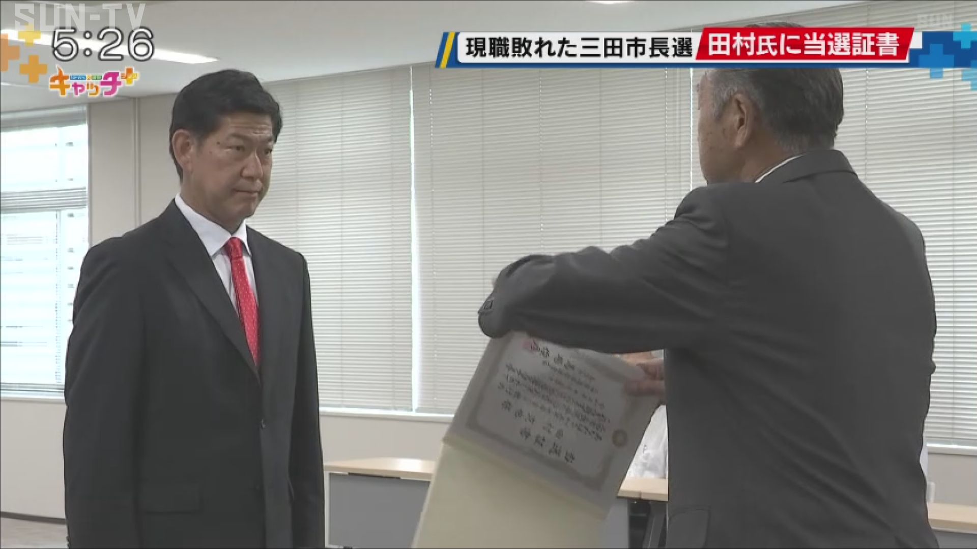 現職敗れた三田市長選 新人・田村氏に当選証書授与