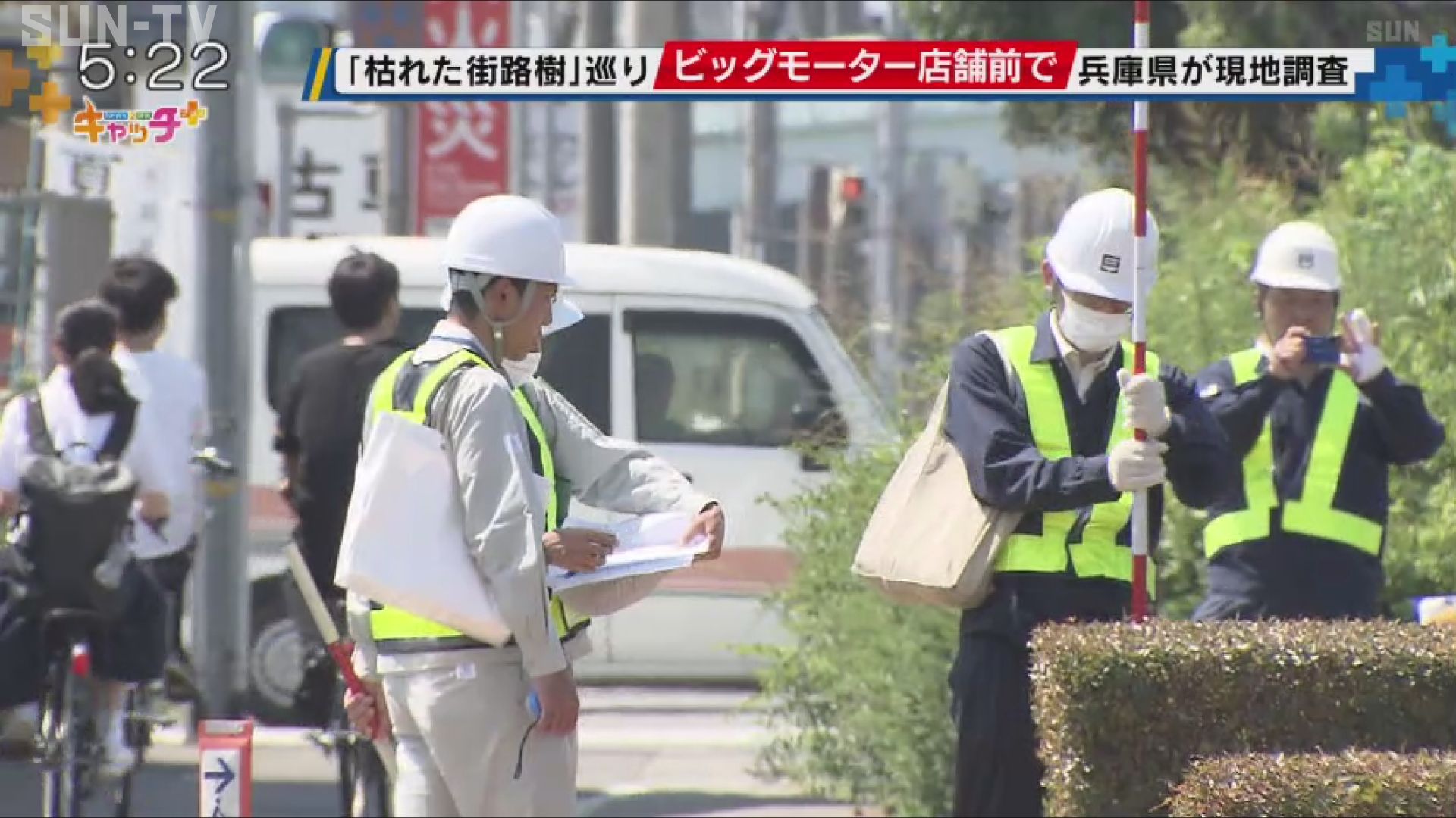 中古車販売大手ビッグモーターの店の前にある街路樹が不自然に枯れるなどしている問題で、兵庫県は7月28日、県が管理する道路沿いにある加古川市の店舗で現地調査を行いました。