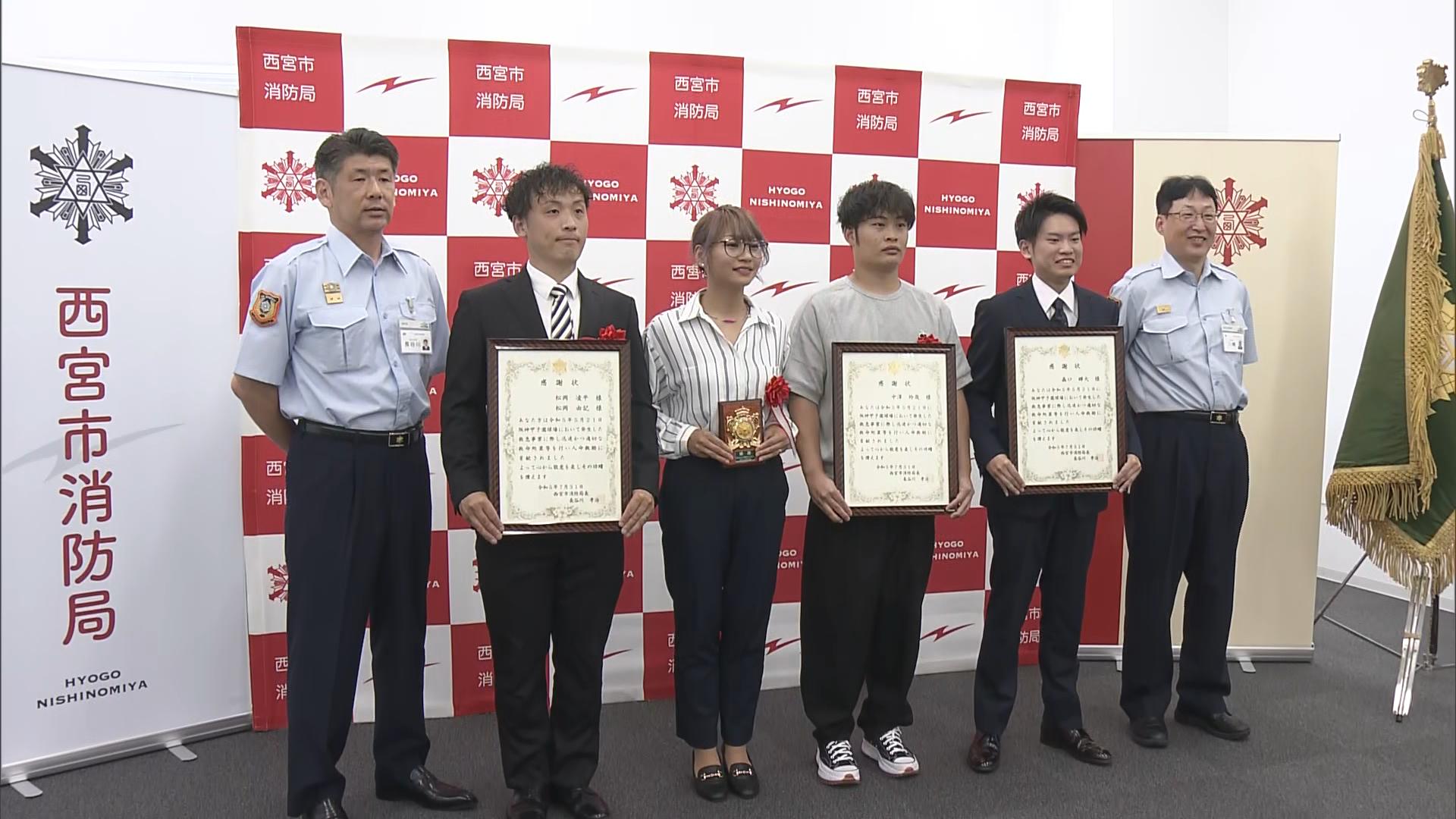 西宮市消防局から感謝状が贈られたのは、奈良県に住む松岡凌平さん・由記さん夫婦と、いずれも神戸市に住む看護師の中澤玲哉さん、大学生で球場アルバイトの森口輝大さんの4人です。