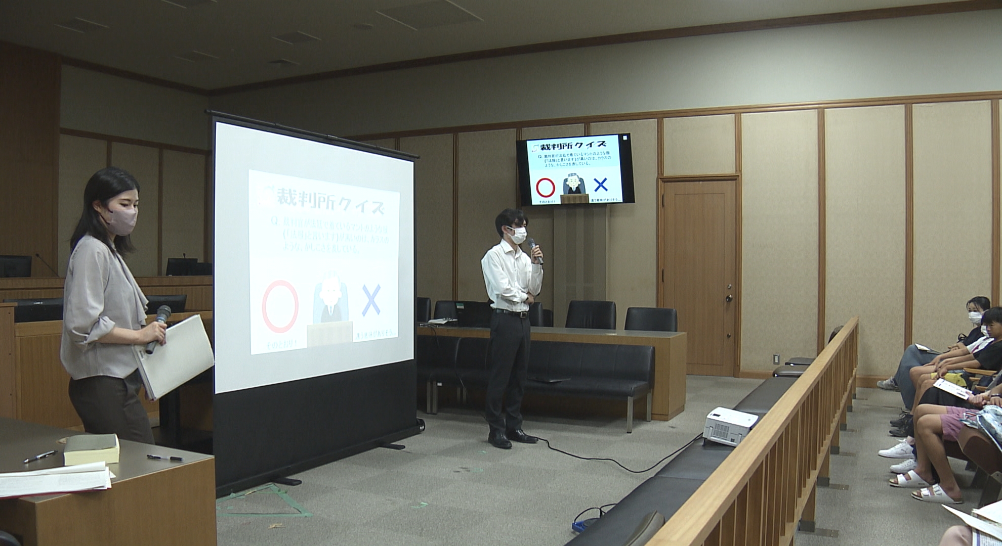 子どもたちは実際の傍聴席に座り裁判所や法律にまつわるクイズに挑戦し、 裁判の制度や裁判官の仕事について学びました。