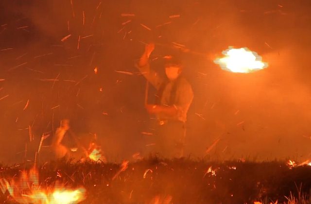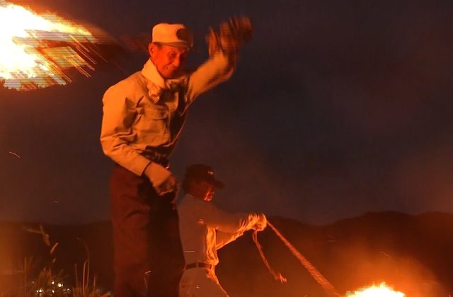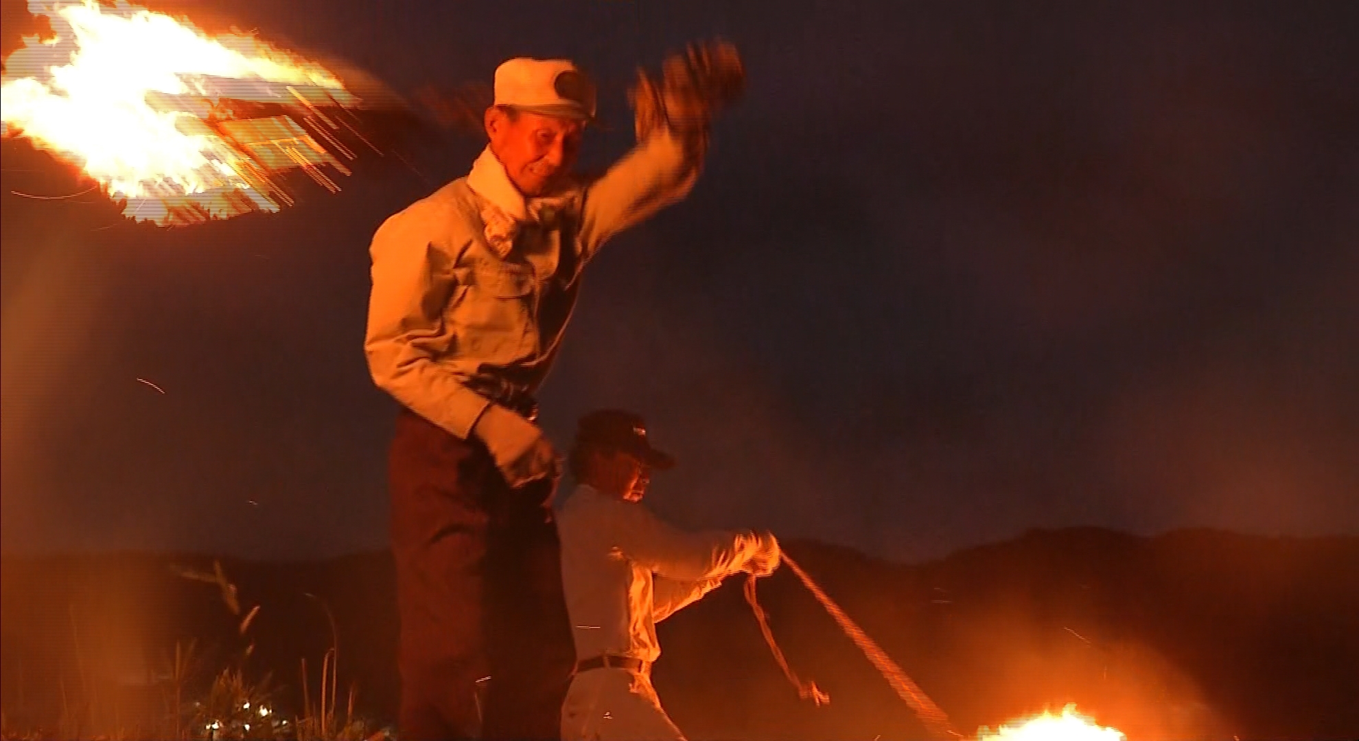 「ことしも先祖様をお盆ということで大きなたいまつを回しまして、あの世にお送りする送り火の行事」