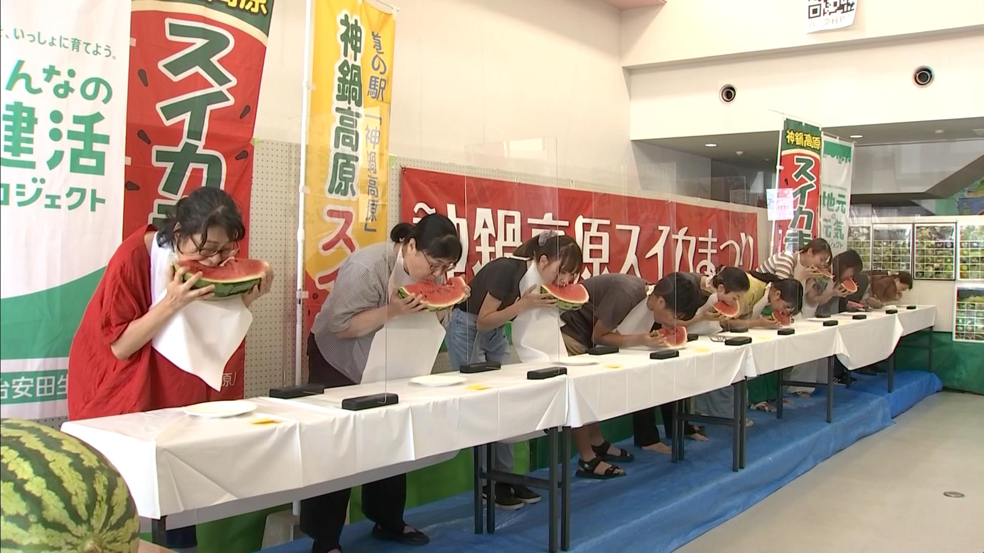 兵庫県豊岡市の神鍋高原では、特産の神鍋スイカを振る舞う恒例の「スイカまつり」が開かれ、多くの人でにぎわいました。