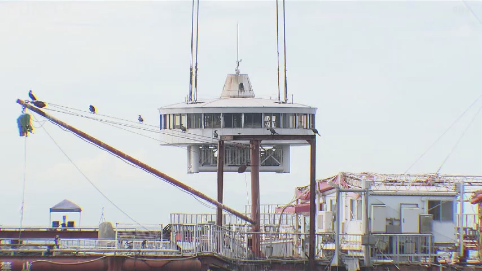 円形の管理塔が大型クレーンでつり上げられ、撤去されました。