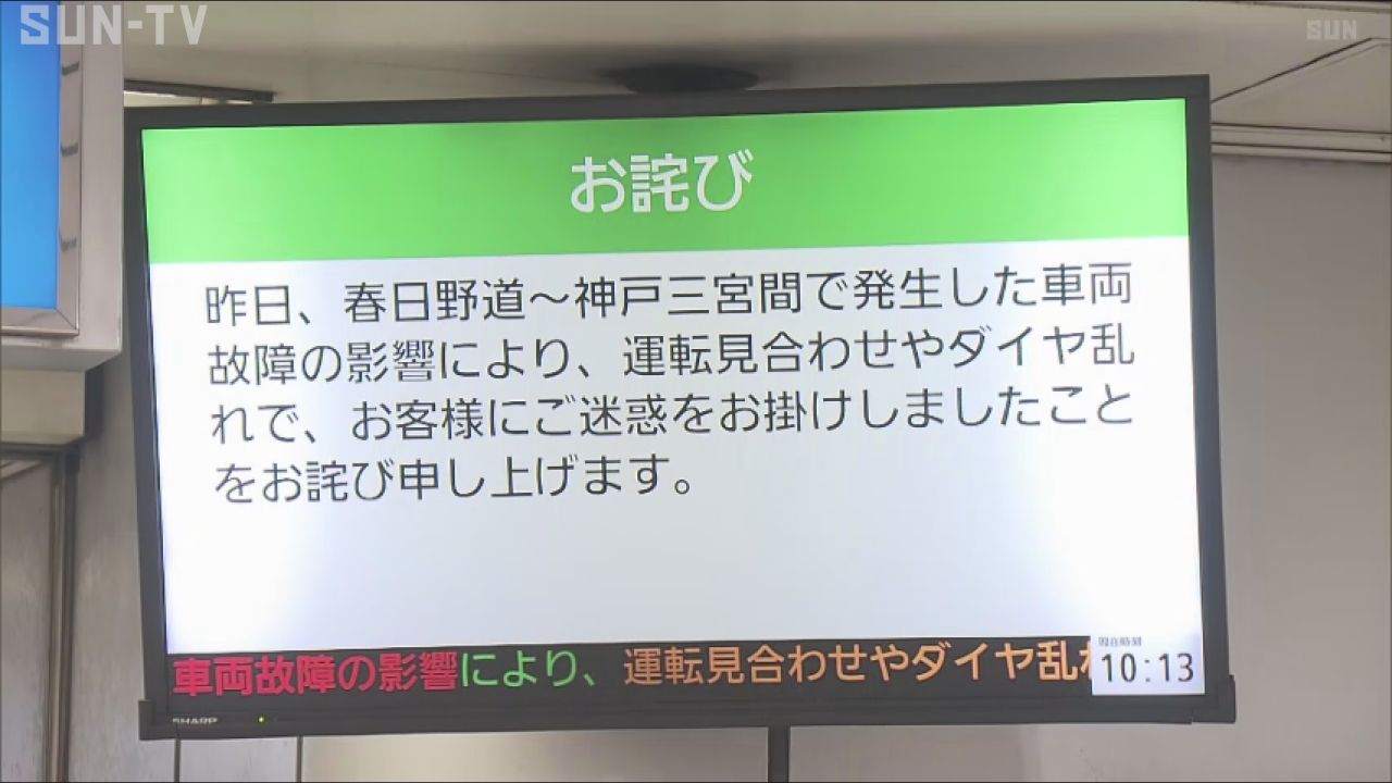 阪神電鉄によりますと、故障があったのは5両目の車両で、この影響で、神戸三宮駅から御影駅でおよそ3時間運転を見合わせ、およそ1万7000人に影響が出たということです。