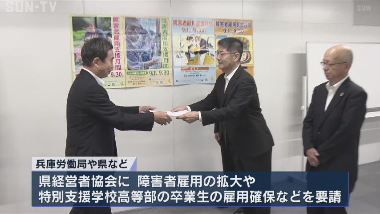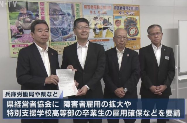 要請書を手渡したのは兵庫県の片山副知事などで、約400の企業が加盟する県経営者協会に対し、障害者雇用の拡大や特別支援学校高等部の卒業生の雇用確保などを求めました。