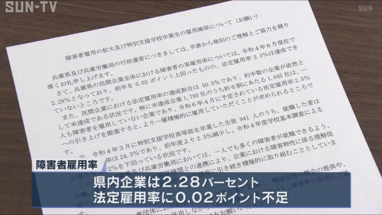兵庫労働局によりますと県内企業の障害者雇用率は2.28%で、法定雇用率には0.02ポイント届いていないということです。