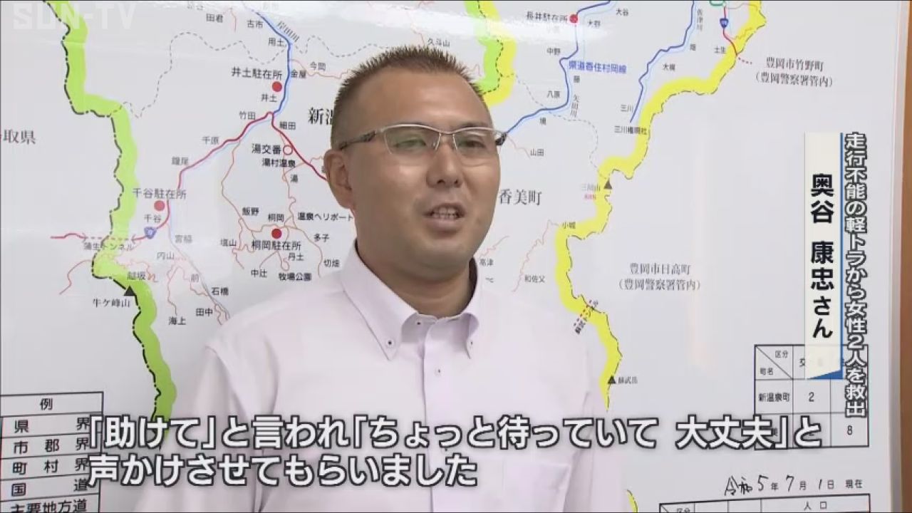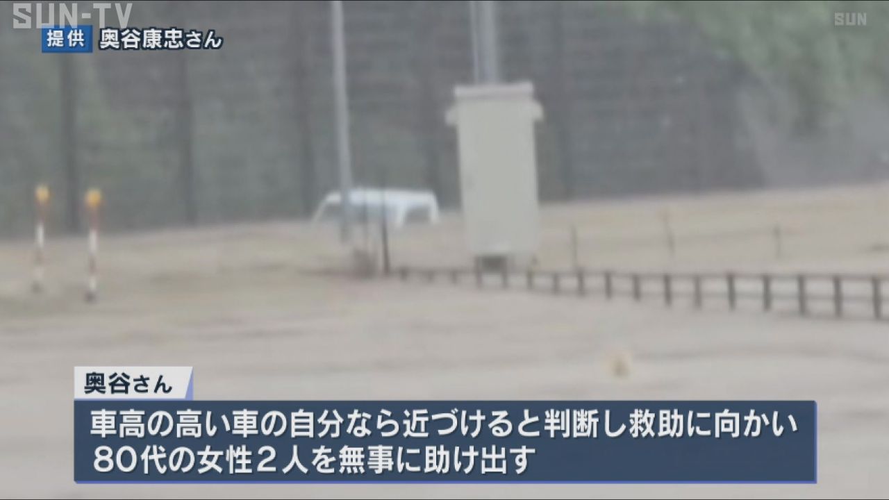警察官から水につかって走行不能の軽トラックに人が取り残されていると聞き、車高の高い車の自分なら近づけると判断して救助に向かい、80代の女性2人を無事に助け出しました。