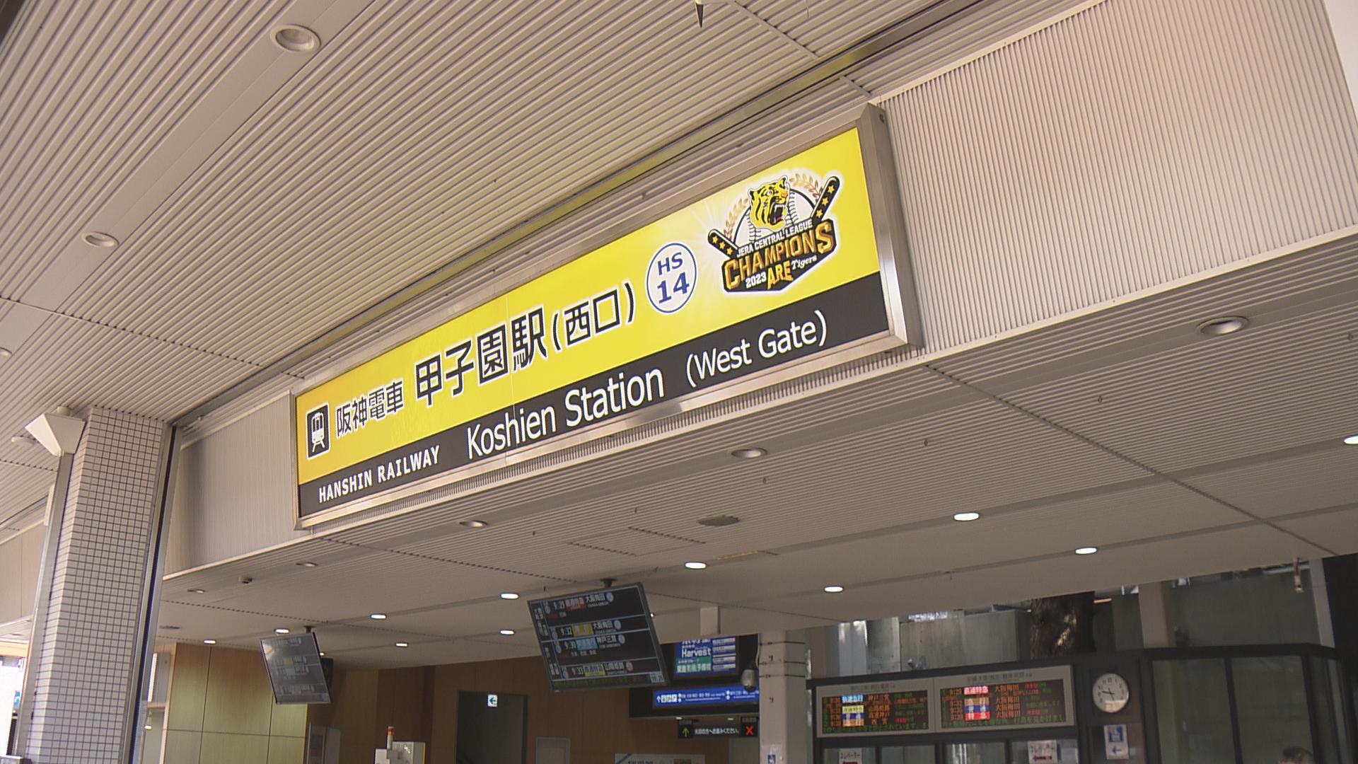 甲子園駅前では、試合の観戦に訪れたタイガースファンや普段から駅を利用する人たちが足を止めて、虎柄に彩られた駅名の看板を写真に収めるなどしていました。
