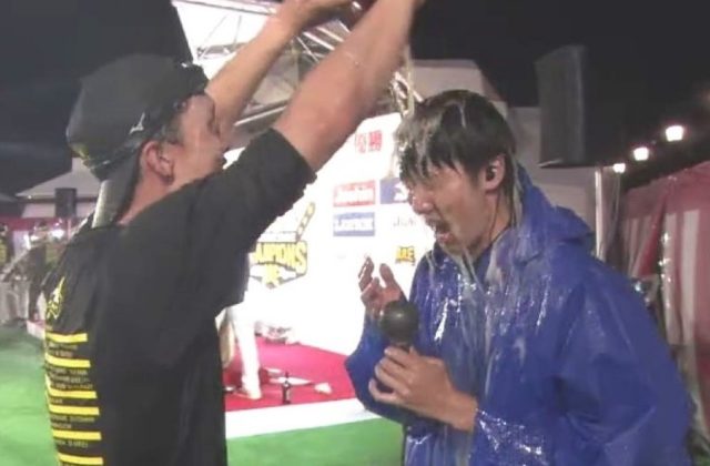 小幡選手(左)からビールをかけられる村上昂輝アナ(右)