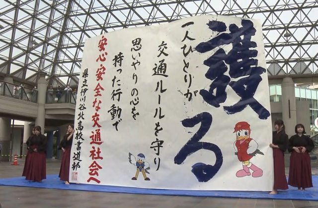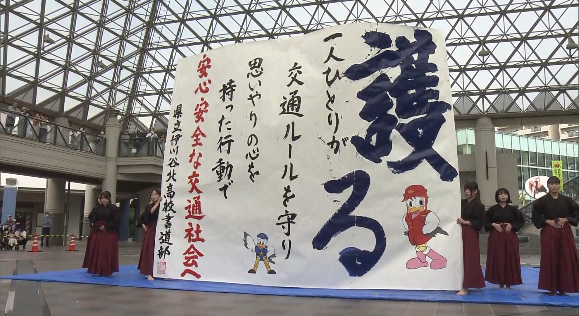秋の全国交通安全運動に合わせ、高校生が書道パフォーマンスを通して交通安全を呼び掛けるキャンペーンが9月23日、兵庫県神戸市内で開かれました。