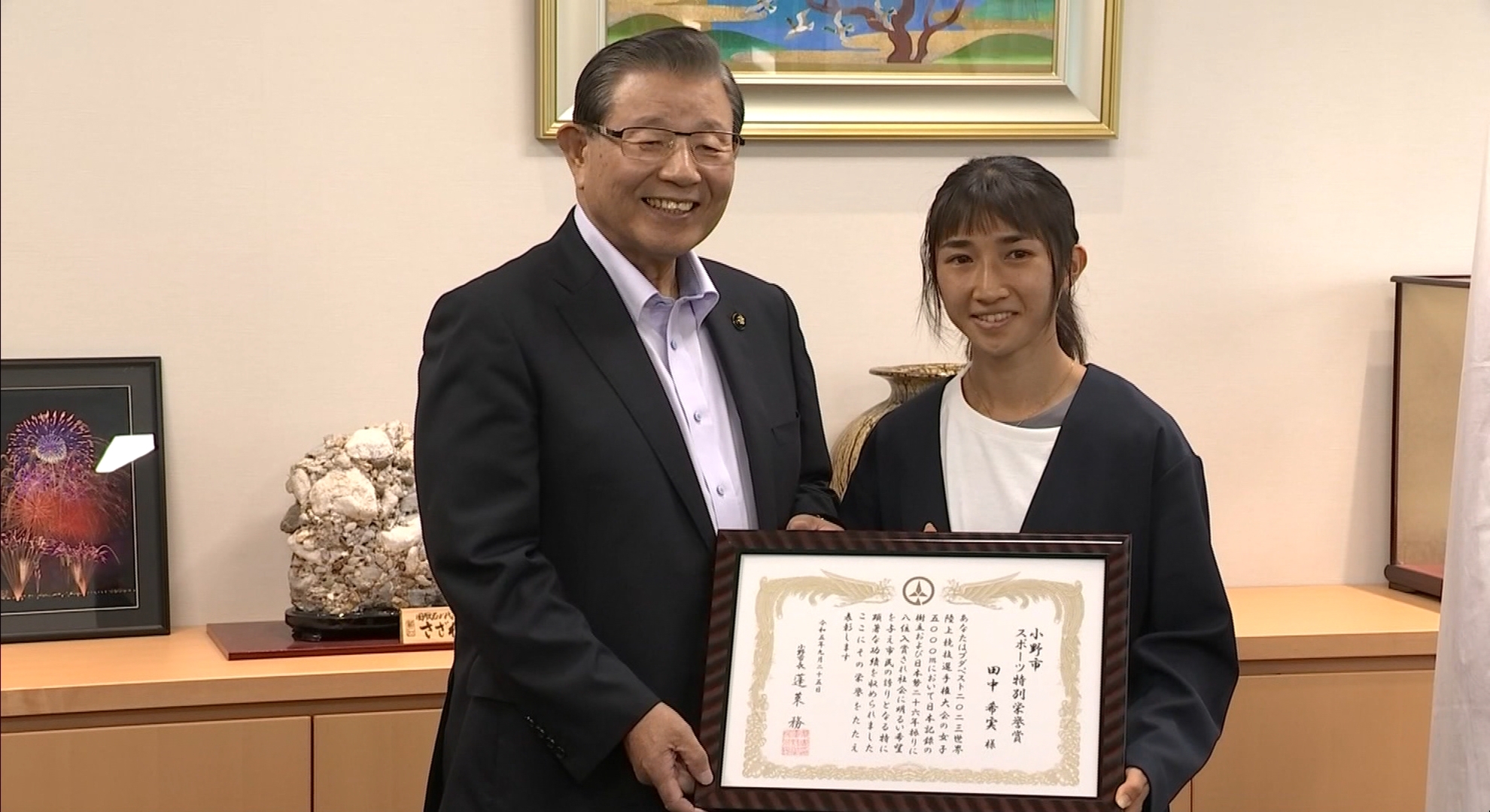 陸上女子の田中希実選手に、出身地の兵庫県小野市からスポーツ特別栄誉賞が贈られました。