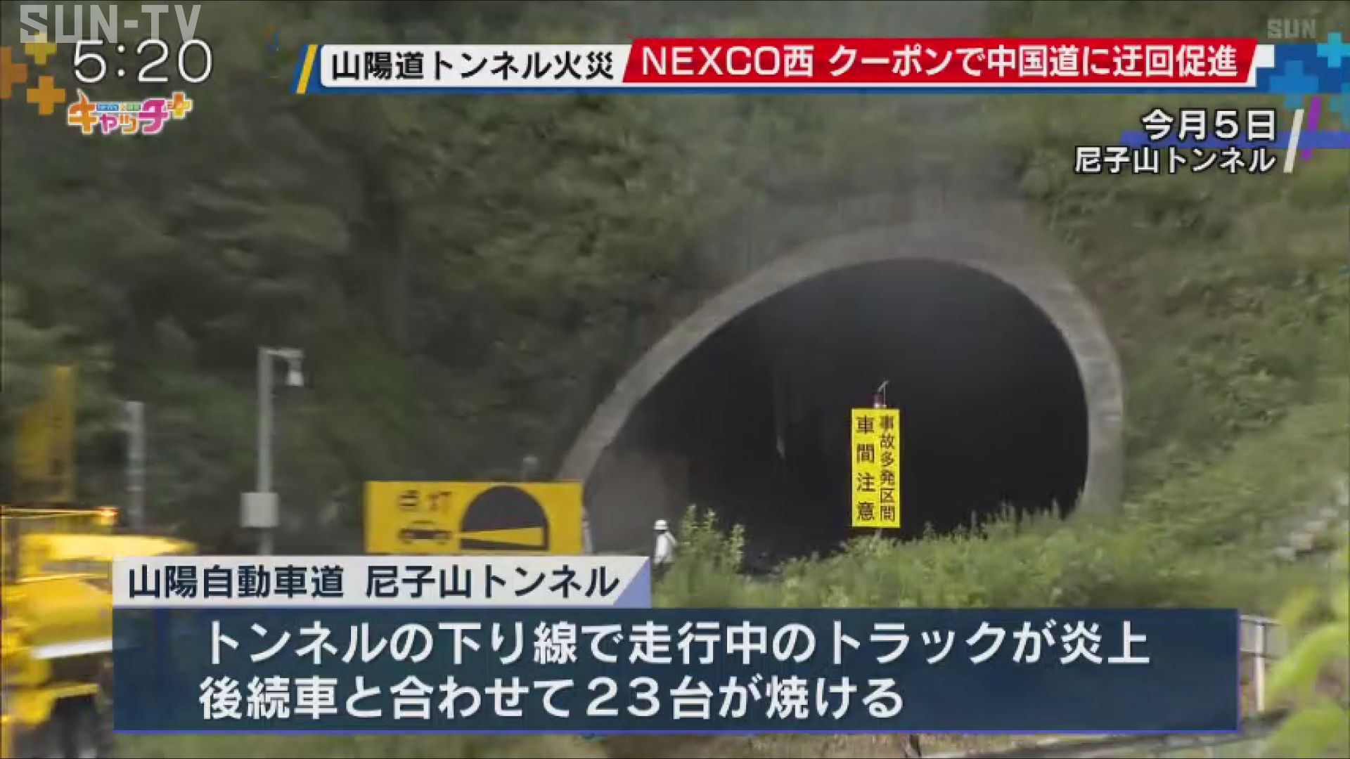 9月5日、相生市と赤穂市にまたがる山陽自動車道の尼子山トンネルの下り線で走行中のトラックが炎上し、後続車と合わせて23台が焼けました。