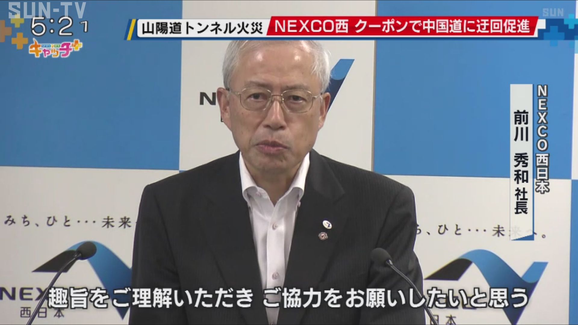 NEXCO西日本の前川社長は27日の会見で、中国道への迂回を促すため、迂回した利用者に対し、指定のサービスエリアなどで使えるクーポンを発行すると発表しました。