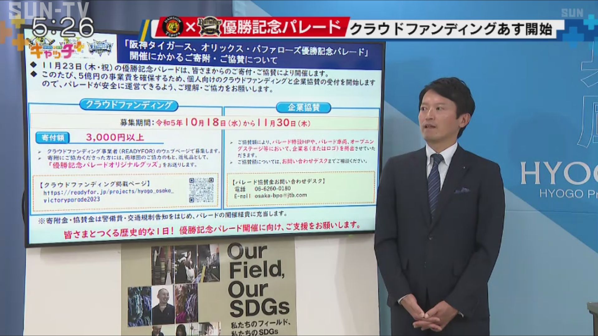 10月17日に兵庫県の斎藤知事が、阪神タイガースとオリックス・バファローズの優勝記念パレード開催に向け、18日からクラウドファンディングを開始すると発表しました。
