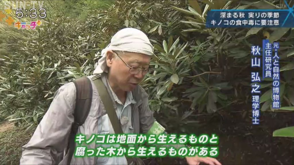 今回、キノコについて解説してくれるのは、元・人と自然の博物館の主任研究員秋山弘之理学博士です。専門はコケ植物ですが、キノコの研究も30年続けています。