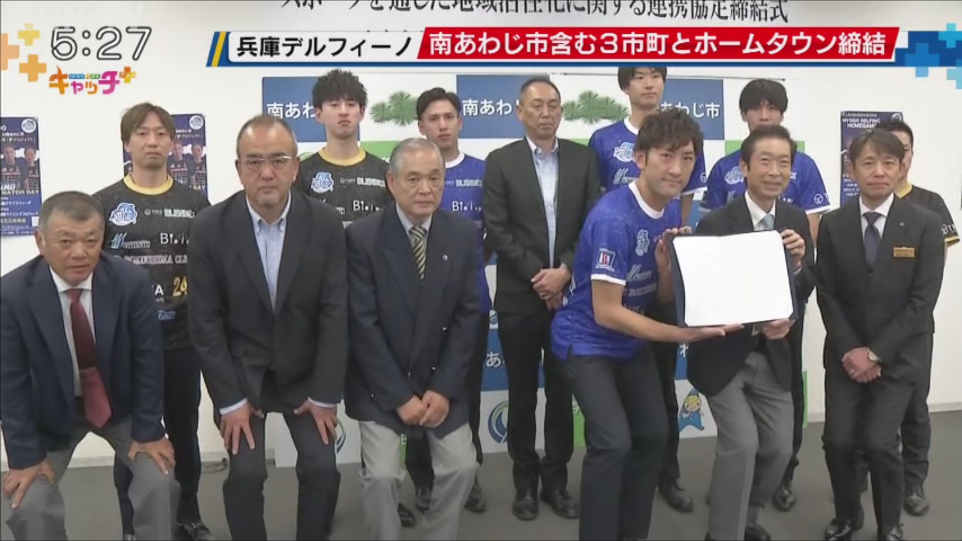 男子バレーボールV3の「兵庫デルフィーノ」は、26日、南あわじ市を含む2市1町と連携協定を結びました。