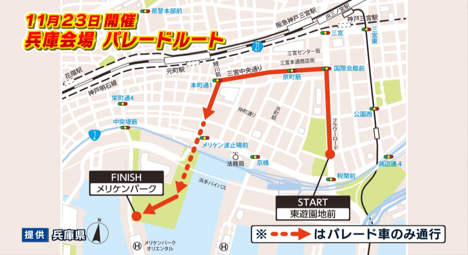兵庫会場でのパレードは、神戸・三宮の東遊園地前から始まり、フラワーロードを北上。
