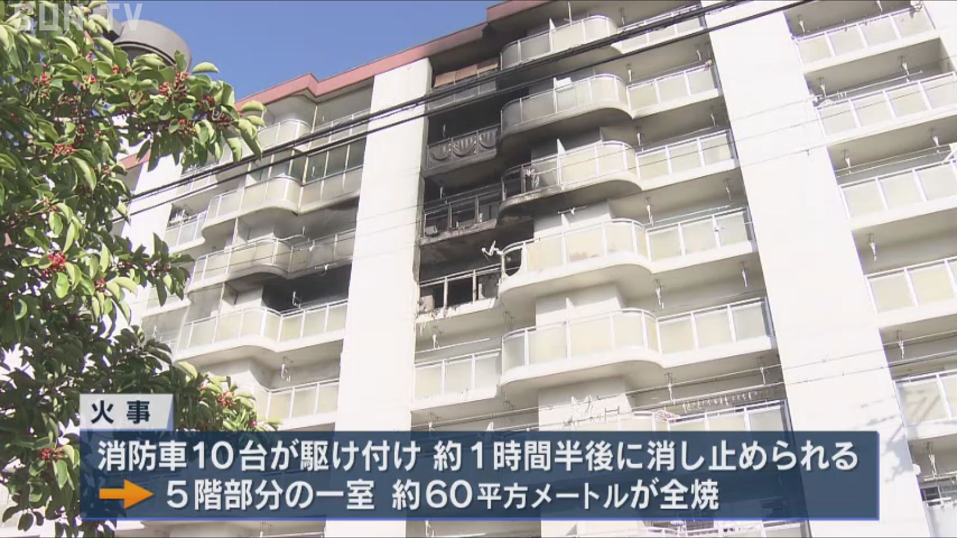 消防車10台が駆けつけ、火はおよそ1時間半後に消し止められましたが、5階部分の一室およそ60平方メートルが全焼しました。