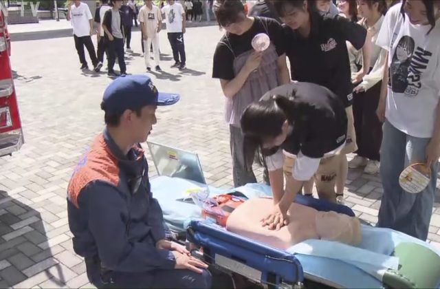会場となったポートアイランド中公園では、バケツリレーや放水訓練、心肺蘇生法などの体験ブースが設けられ、参加者は真剣な表情で訓練に取り組んでいました。
