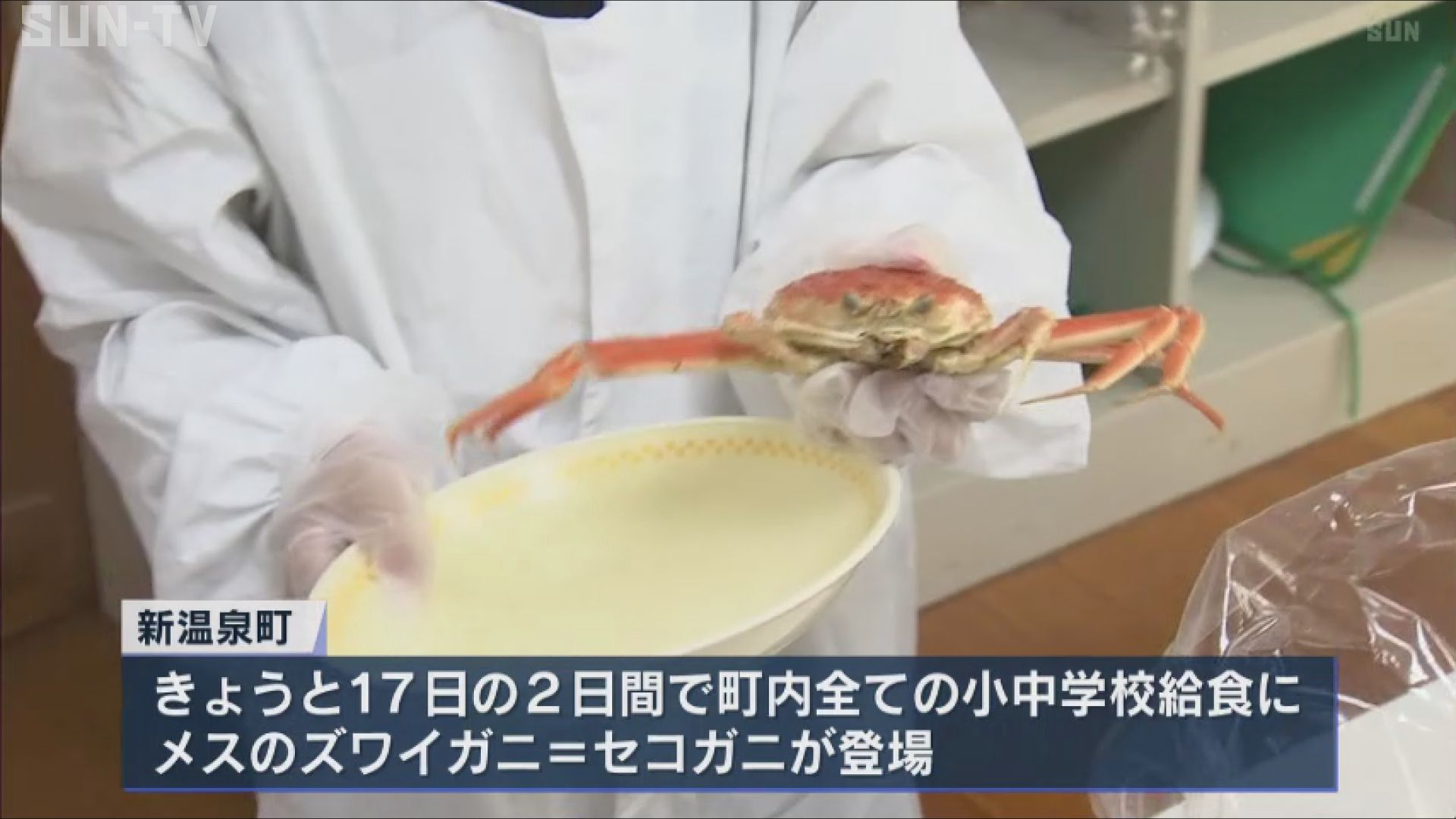 新温泉町では、14日と17日の2日間で、町内にある全ての小中学校の給食に、メスのズワイガニ=セコガニが登場します。