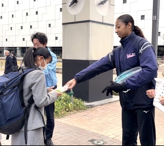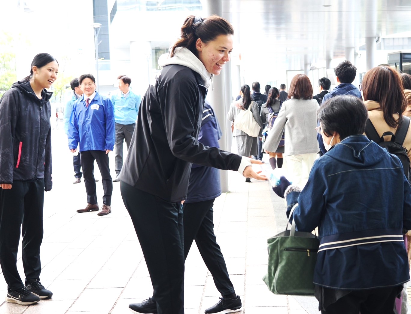 日本代表・宮部藍梨(みやべ・あいり)選手らが「ぜひこの機会に納税について考えてみてください」と声をかけながら、ティッシュを手渡していた。