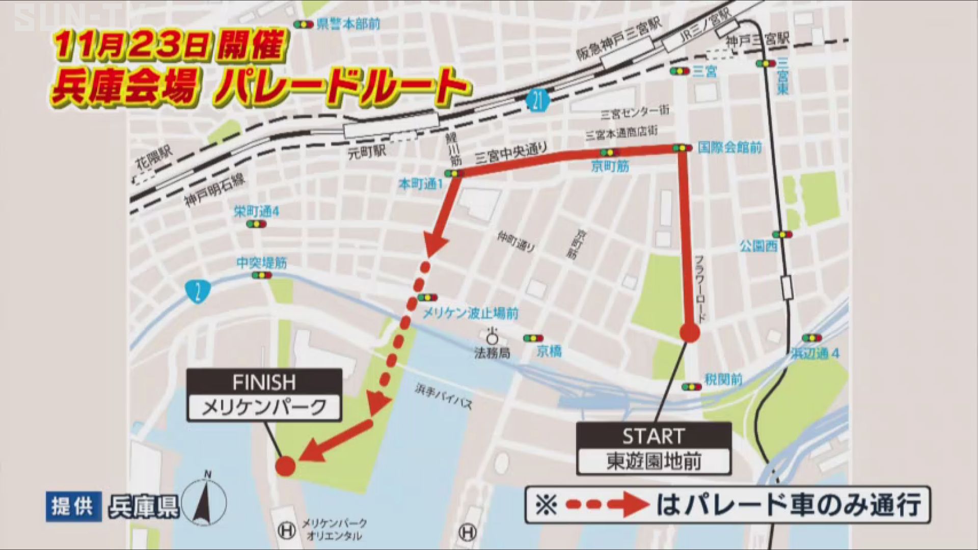 兵庫会場の優勝記念パレードは神戸・三宮の東遊園地前を出発し、元町の大丸神戸店前を経由してメリケンパークへ向かうおよそ2キロのルートです。