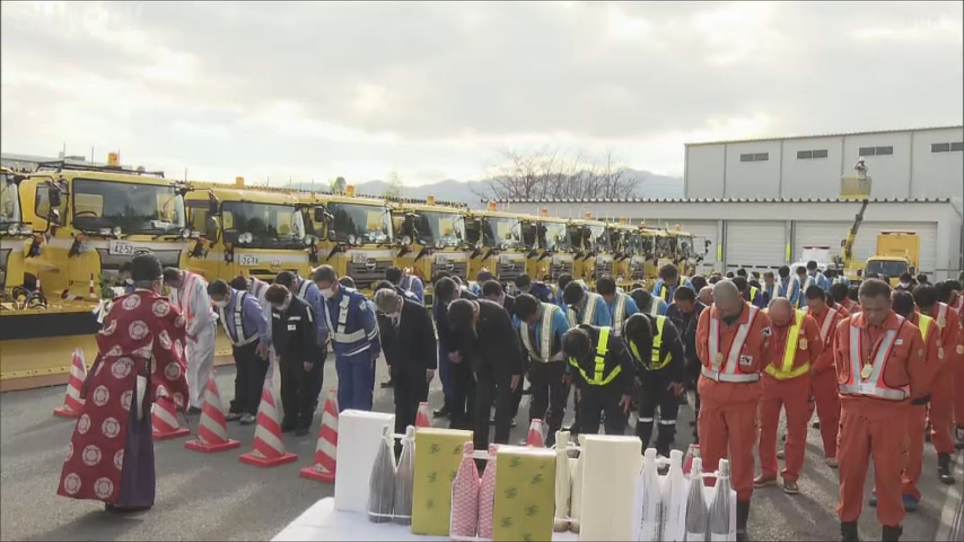 中国自動車道西宮北インターチェンジの敷地内で行われた安全祈願祭には、除雪車およそ30台が出動した他、事務所職員や県警高速隊員らおよそ50人が出席しました。