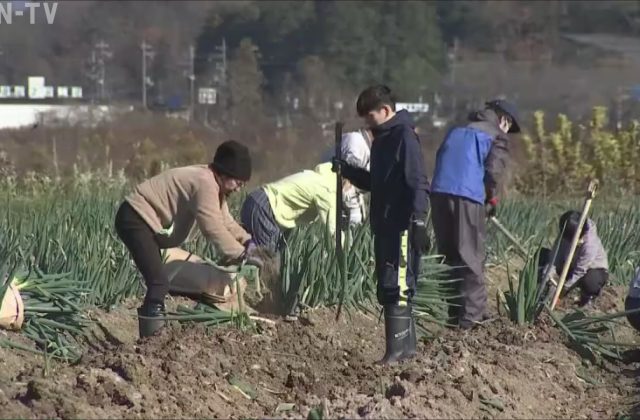 兵庫県朝来市特産の「岩津ねぎ」の収穫が、11月23日の販売解禁を前に21日から始まりました。